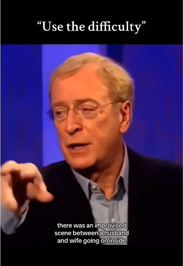 This week, I came across actor Michael Caine’s phrase: Use the Difficulty. As he shares in this short video below, early in his career6, a more experienced actor told him to turn any problem into part of the scene. He took that advice and turned it into a family motto, for both on and off the stage: